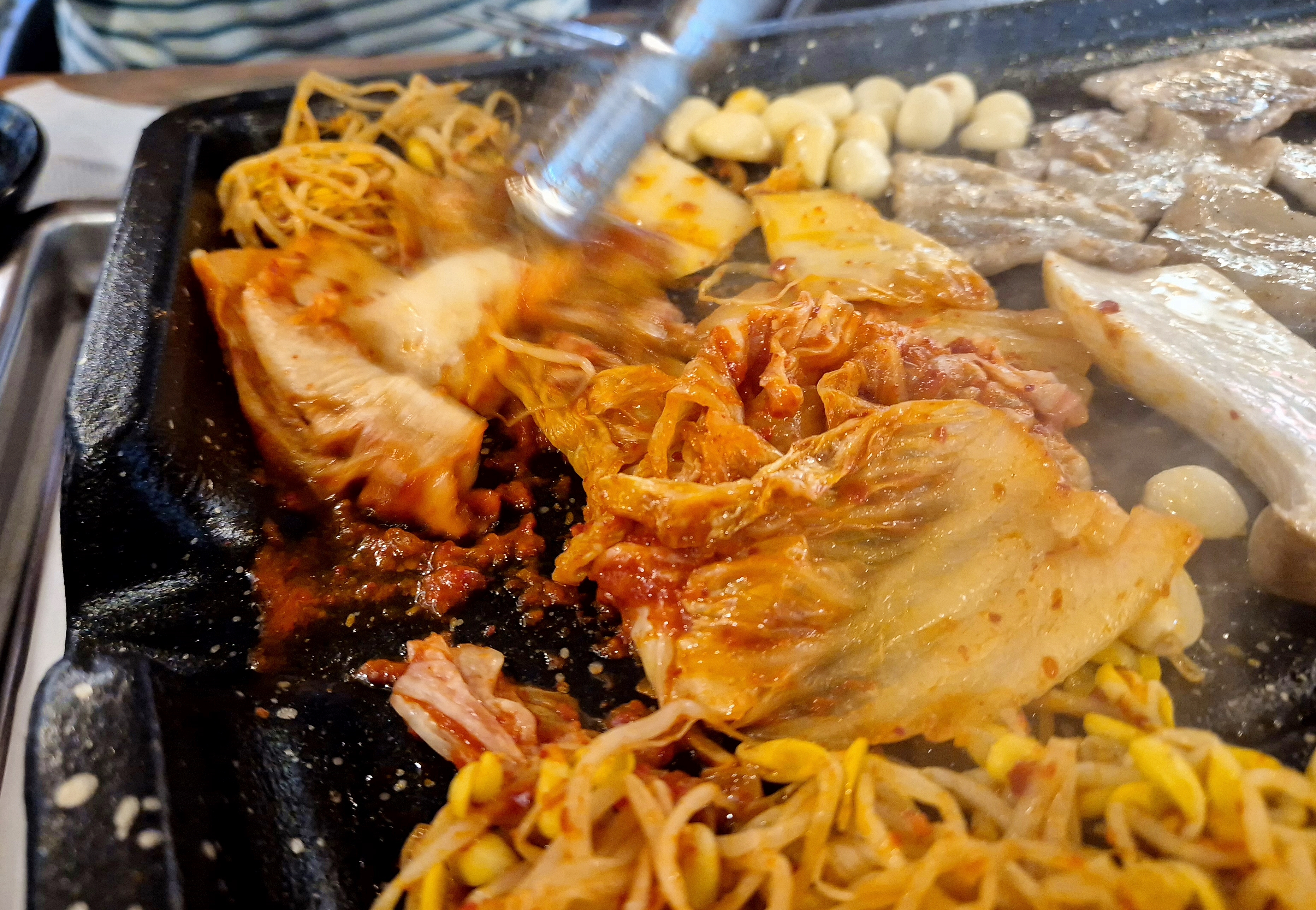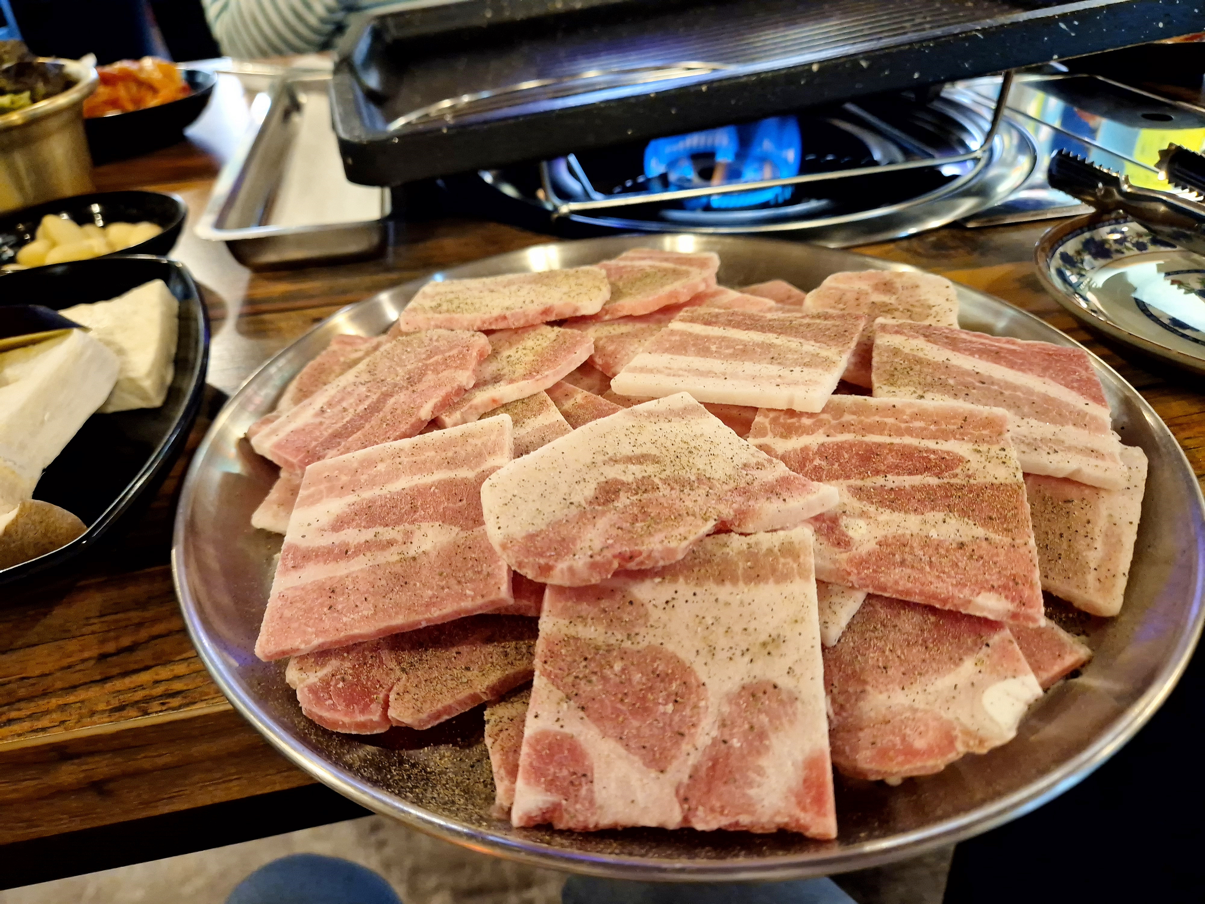 한국인이라면 불판위에 구운 김치와 삼겹살... 맛이 없을 수가 없었어요.